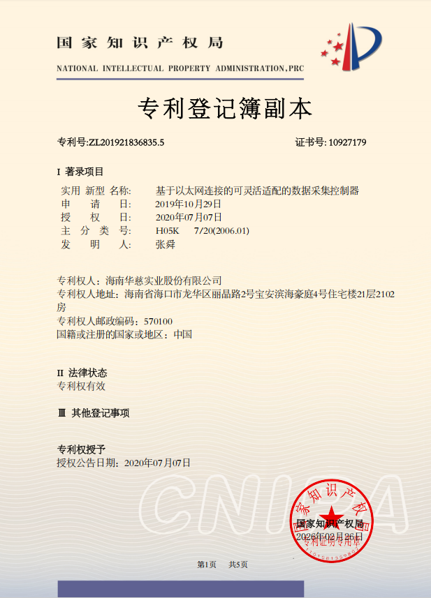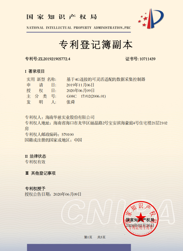 近日,从国家知识产权局获悉,海南华慈实业股份有限公司新获两项国家实用新型专利,分别为“基于4G连接的可灵活适配的数据采集控制器”(专利号:ZL201921905772.4 证书号: 10711439)与“基于以太网连接的可灵活适配的数据采集控制器”(专利号:ZL201921836835.5 证书号: 10927179)。